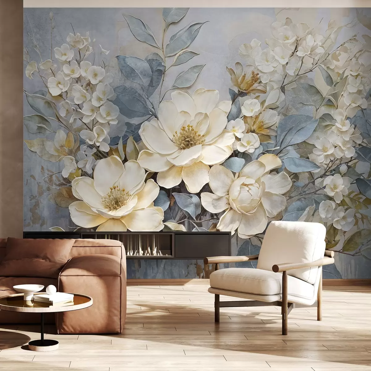 Fotomurales Grandes flores blancas y amarillo pálido con hojas gris verdosas sobre un fondo suave y difuminado Nr. w08404