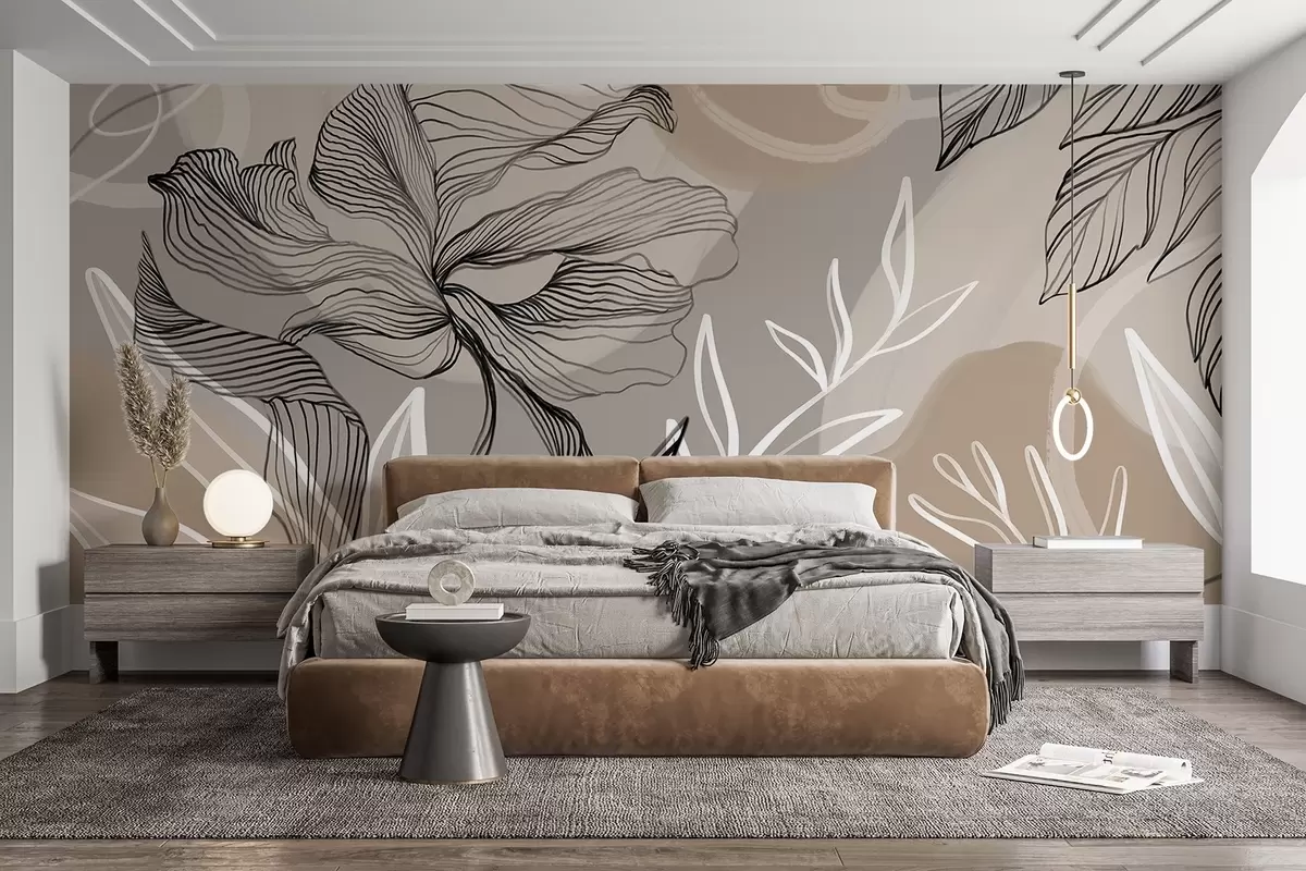 Fotomurales Elegante estampado floral con grandes flores y hojas de líneas abstractas en tonos grises y beige sobre fondo claro Nr. w08413