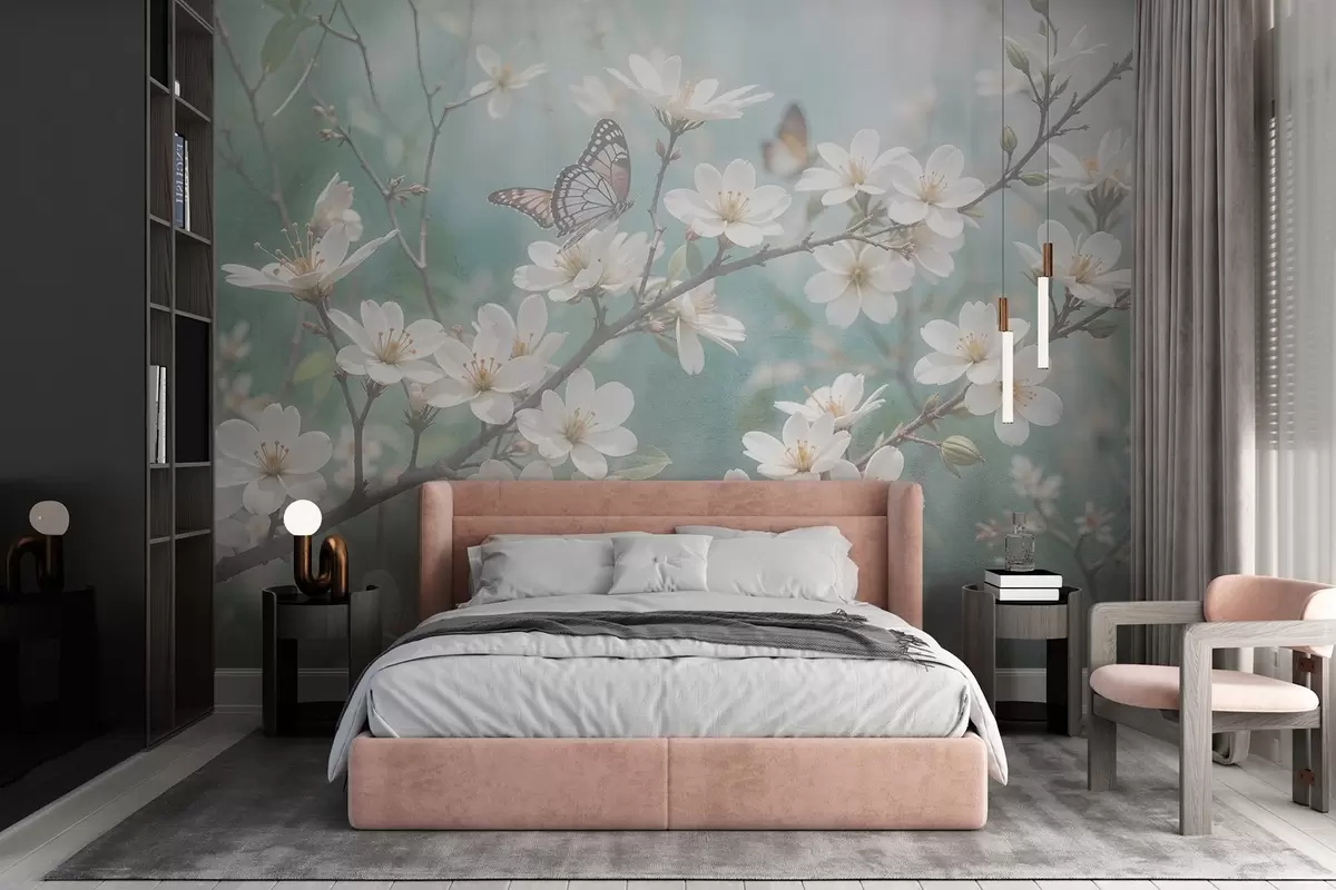 Fotomurales Una mariposa blanca sobre una rama con delicadas flores blancas de cerezo en primer plano sobre un fondo difuminado Nr. w08421