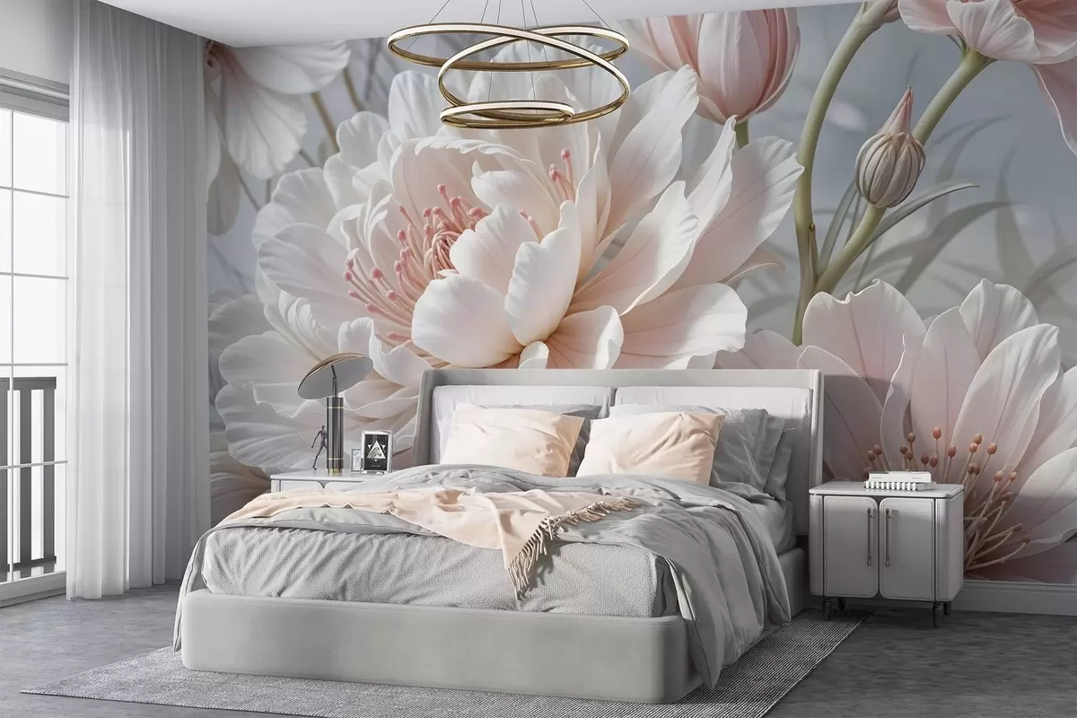 Fotomurales Grandes y delicadas flores de peonía blancas y rosas con pétalos suaves y esponjosos sobre un fondo gris difuminado Nr. w08427