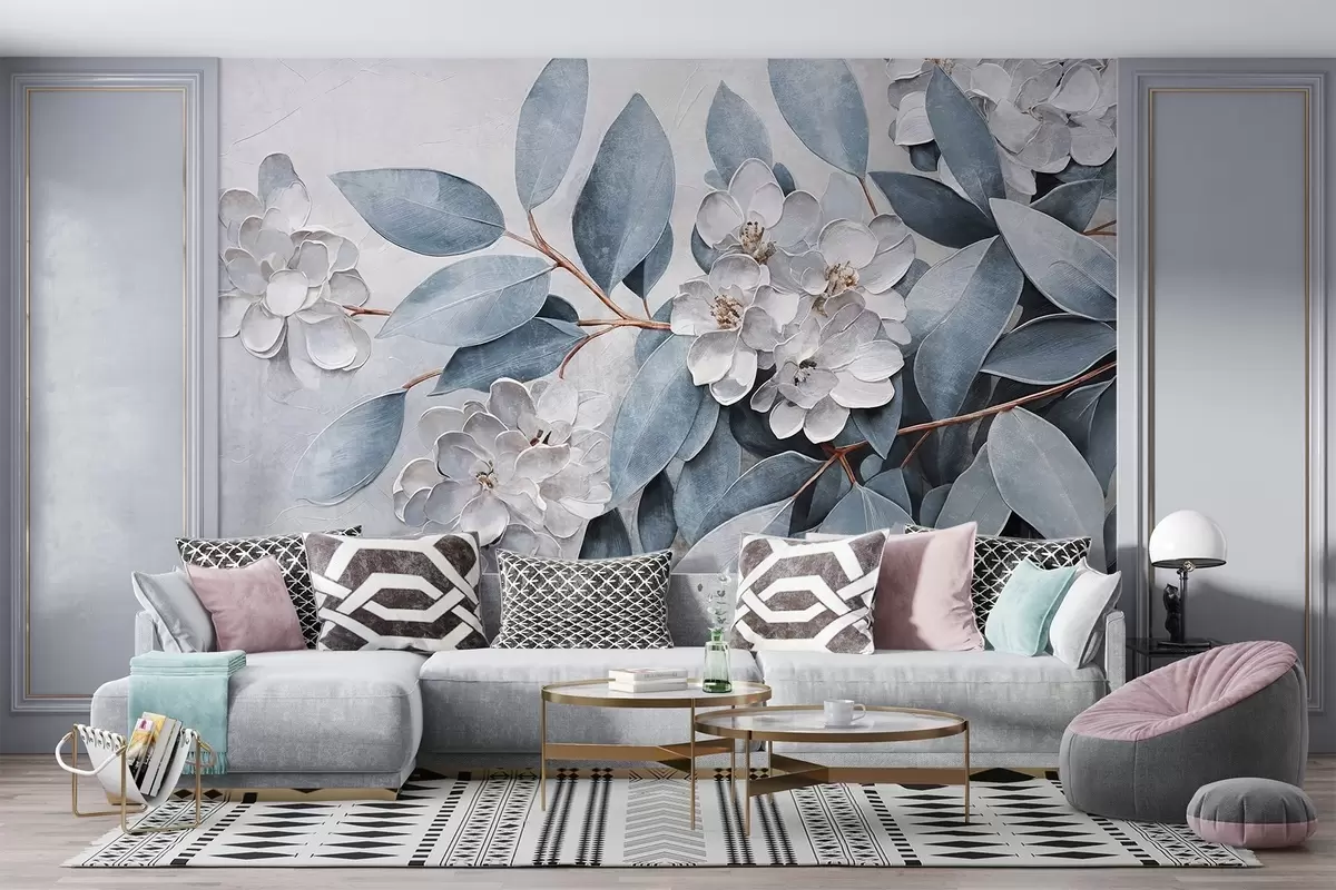 Fotomurales Delicadas flores blancas con hojas de color verde grisáceo sobre un fondo suave y apagado en estilo de pintura al óleo Nr. w08437