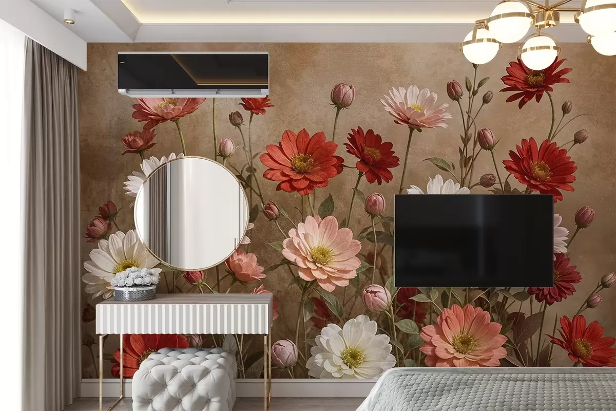 Fotomurales Un campo de coloridas flores parecidas a margaritas en varios tonos de rosa, rojo y blanco sobre un fondo texturizado Nr. w08462