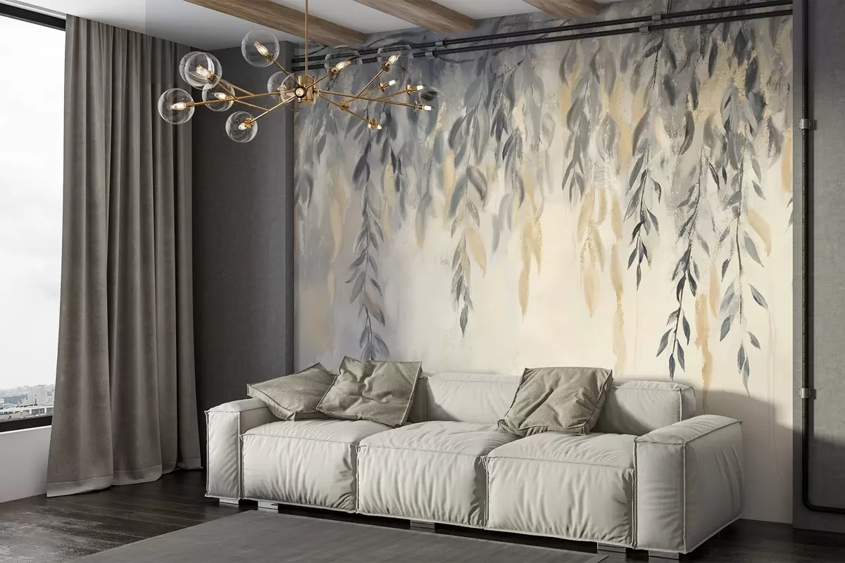 Fotomurales Ramas de sauce con delicadas hojas colgando sobre un fondo de textura suave y difuminada Nr. w08473