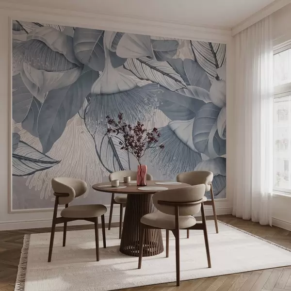 Fotomurales Ilustración botánica de grandes flores azules de eucalipto con largos estambres sobre un fondo gris y blanco Nr. w08539v1