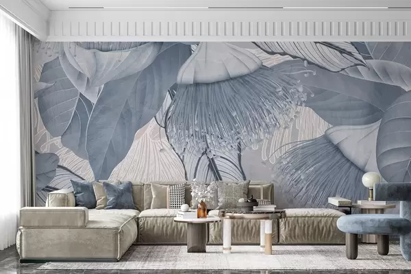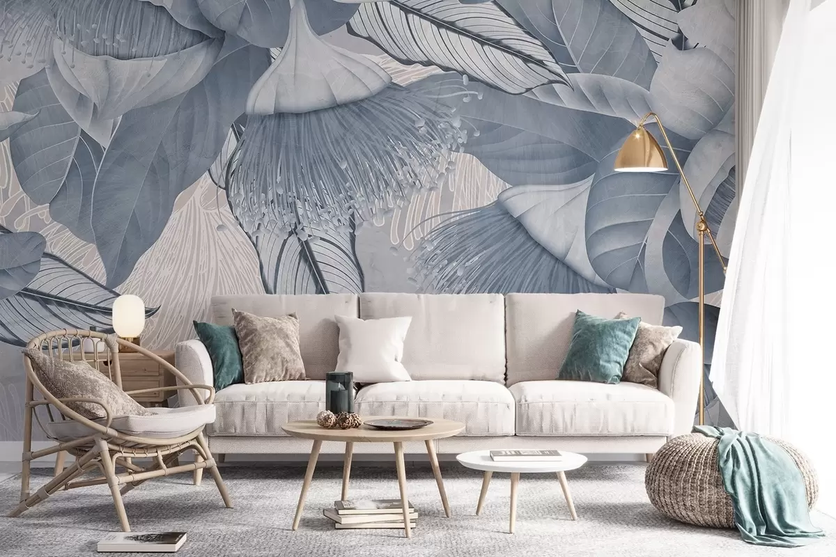 Fotomurales Ilustración botánica de grandes flores azules de eucalipto con largos estambres sobre un fondo gris y blanco Nr. w08539v1