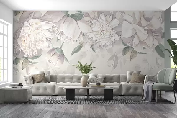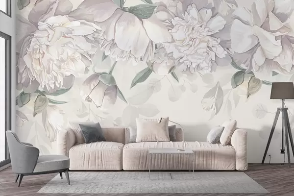 Fotomurales Delicadas peonías blancas y rosas pastel con hojas verdes, dispuestas en un suave y romántico fondo floral Nr. w08577