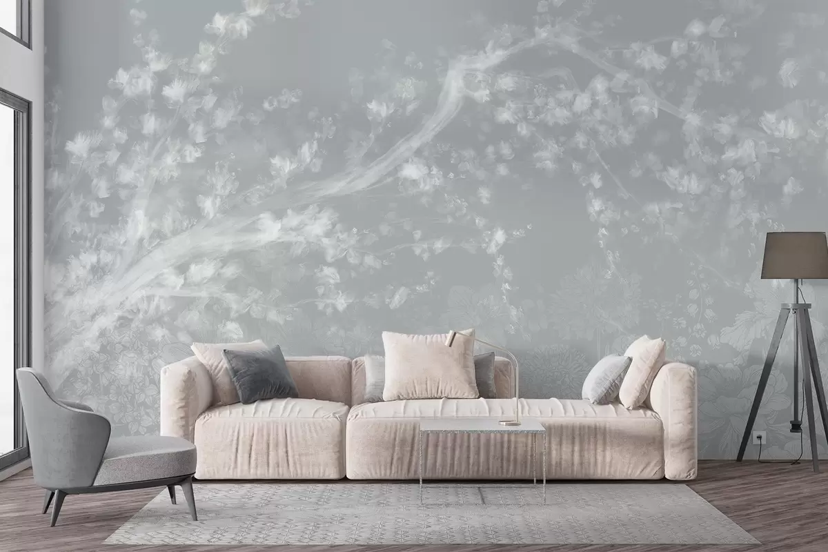 Fotomurales Impresión borrosa y desenfocada con un blanco brumoso de ramas de árbol con fondo floral de luz suave Nr. w08581