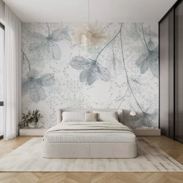 Fotomurales Delicadas flores azules y blancas con largos tallos y pétalos sobre un fondo de textura suave y difuminada Nr. w08588