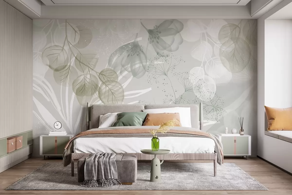Fotomurales Elementos florales de eucalipto en tonos verdes y blancos con hojas y pétalos superpuestos de estilo minimalista Nr. w08599v1