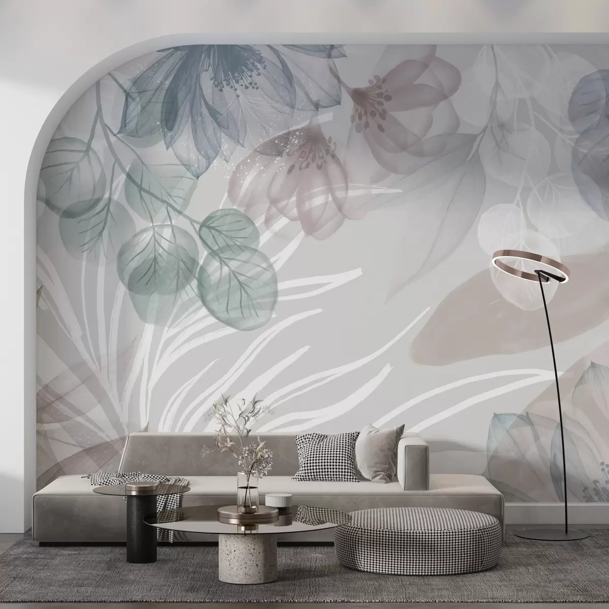 Fotomurales Estampado floral en tonos pastel con grandes flores y hojas abstractas transparentes en tonos grises, rosas y verdes Nr. w08600