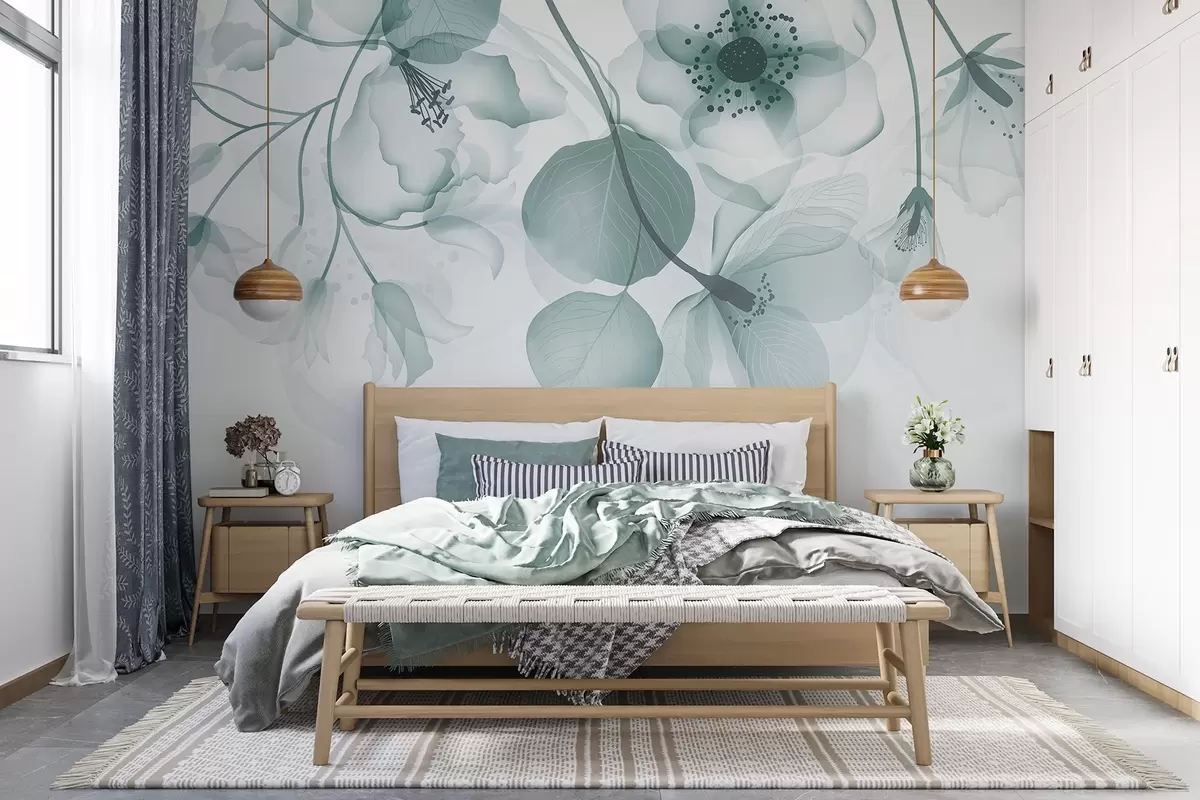 murales de pared Delicadas flores translúcidas de color turquesa apagado, con pétalos suaves y centros oscuros, sobre un fondo claro w08613v1