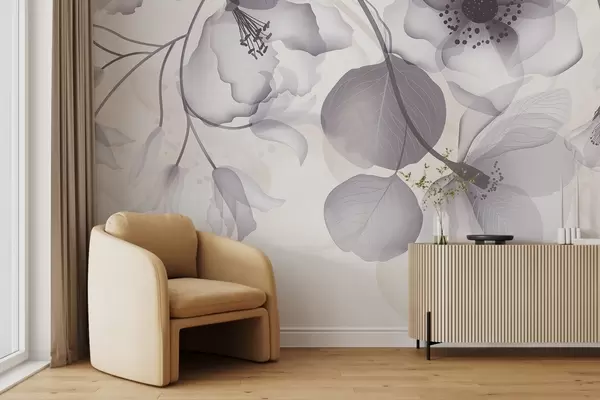 Fotomurales Delicadas flores translúcidas grises y beige con pétalos suaves y centros oscuros, sobre un fondo claro Nr. w08613v2