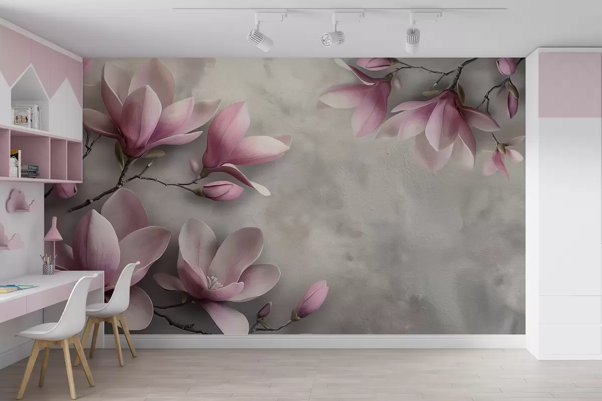 Fotomurales Delicadas magnolias rosas sobre un muro de hormigón en tonos grises Nr. w08636v1