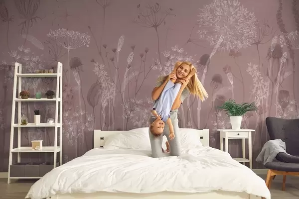 murales de pared Dientes de león y flores silvestres en estilo acuarela en tonos rosados w08637v1