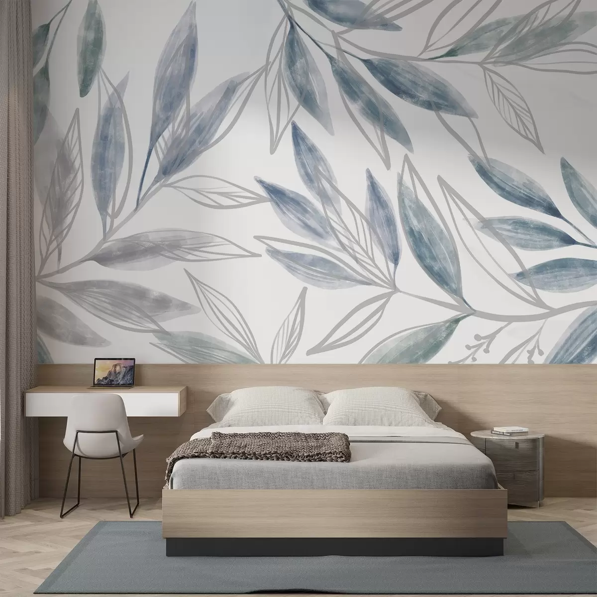 Fotomurales Delicadas hojas en tonos pastel, azules y grises, que crean una composición botánica serena y minimalista Nr. w08642v1