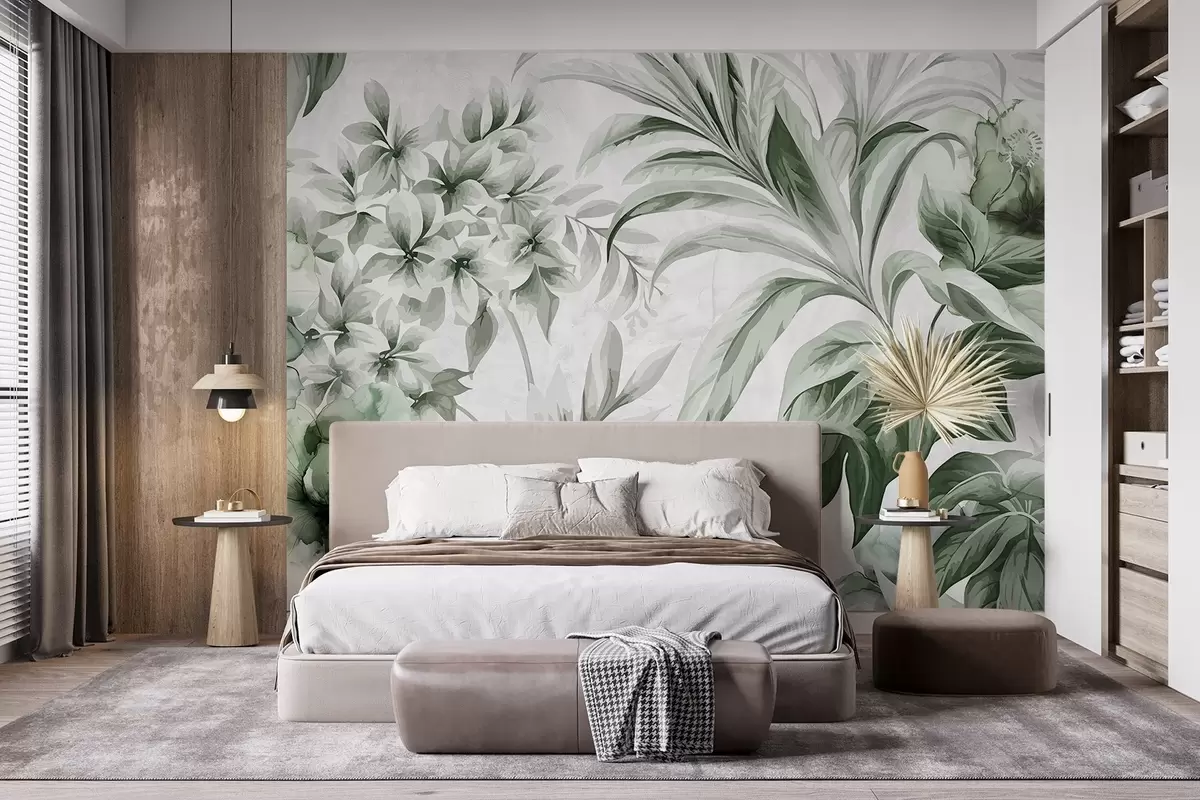 Fotomurales Hojas y follaje tropicales en una paleta apagada que va de tonos claros a oscuros de verde sobre fondo claro texturizado Nr. w08650