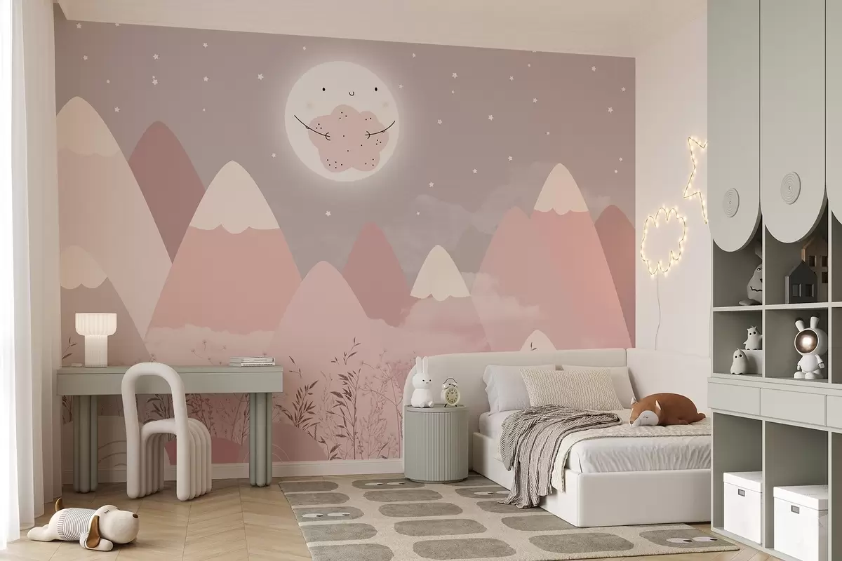 Fotomurales Montañas infantiles con una simpática luna y plantas en la parte inferior Nr. w08659