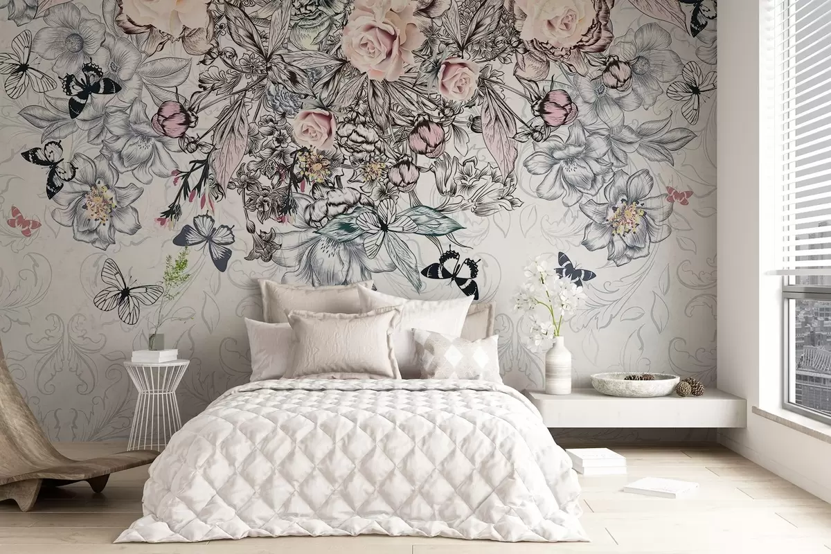 Fotomurales Un dibujo floral con rosas rosadas y varias flores y mariposas con intrincado arte lineal sobre fondo texturizado Nr. w08674