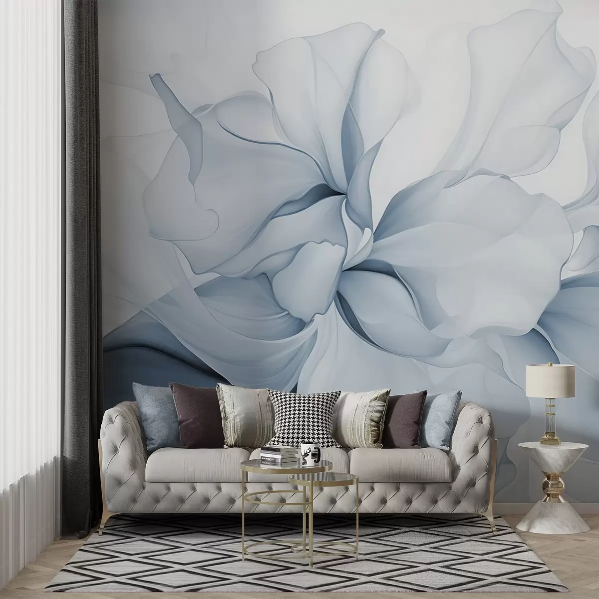 Fotomurales Pétalos florales abstractos fluidos de formas translúcidas y estratificadas en colores pastel, en tonos azules Nr. w08701v2