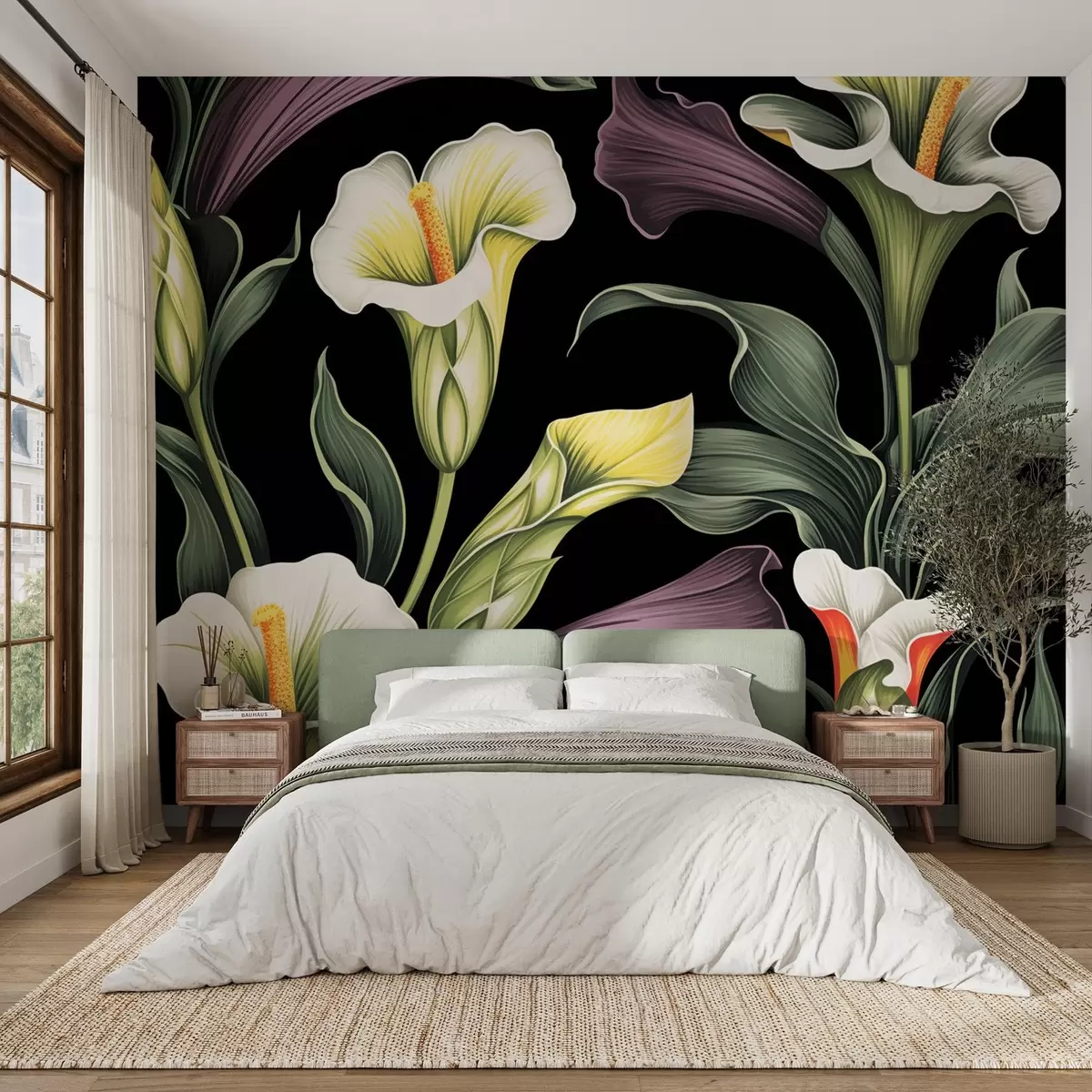 Fotomurales Calas blancas, verdes y moradas sobre fondo negro Nr. w08752