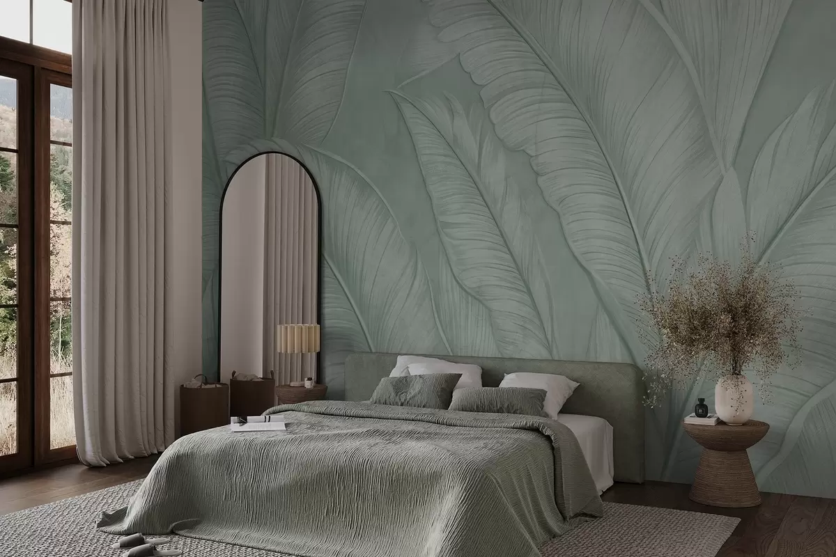 Fotomurales Grandes hojas tropicales de gran textura y detalle en un color verde monocromático de estilo loft Nr. w08772v1