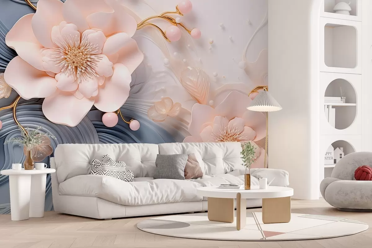 Fotomurales diseño de fondo 3D con flores rosas y perlas sobre olas azules y blancas Nr. w08806