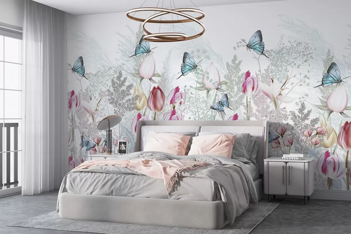 Fotomurales Estampado en tonos pastel con flores de tulipán, hierba y mariposas volando en un jardín Nr. w08834