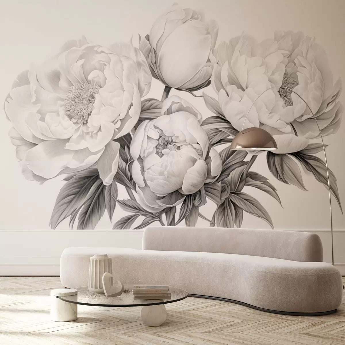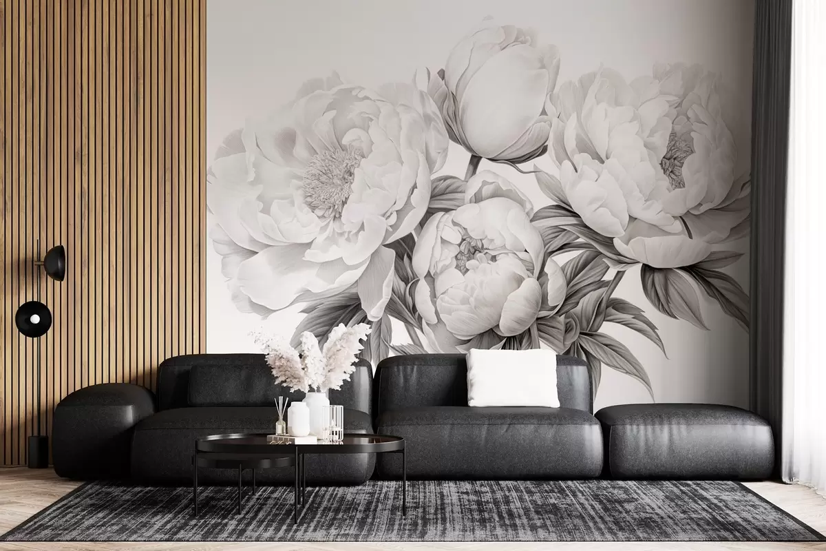Fotomurales Peonías en blanco y negro dibujadas a lápiz Nr. w08852