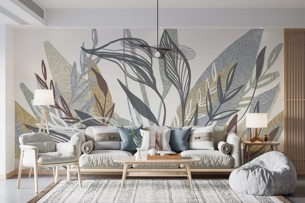 Fotomurales Una colección de hojas de diferentes colores y tamaños, algunas con arte lineal, sobre fondo blanco Nr. w08893