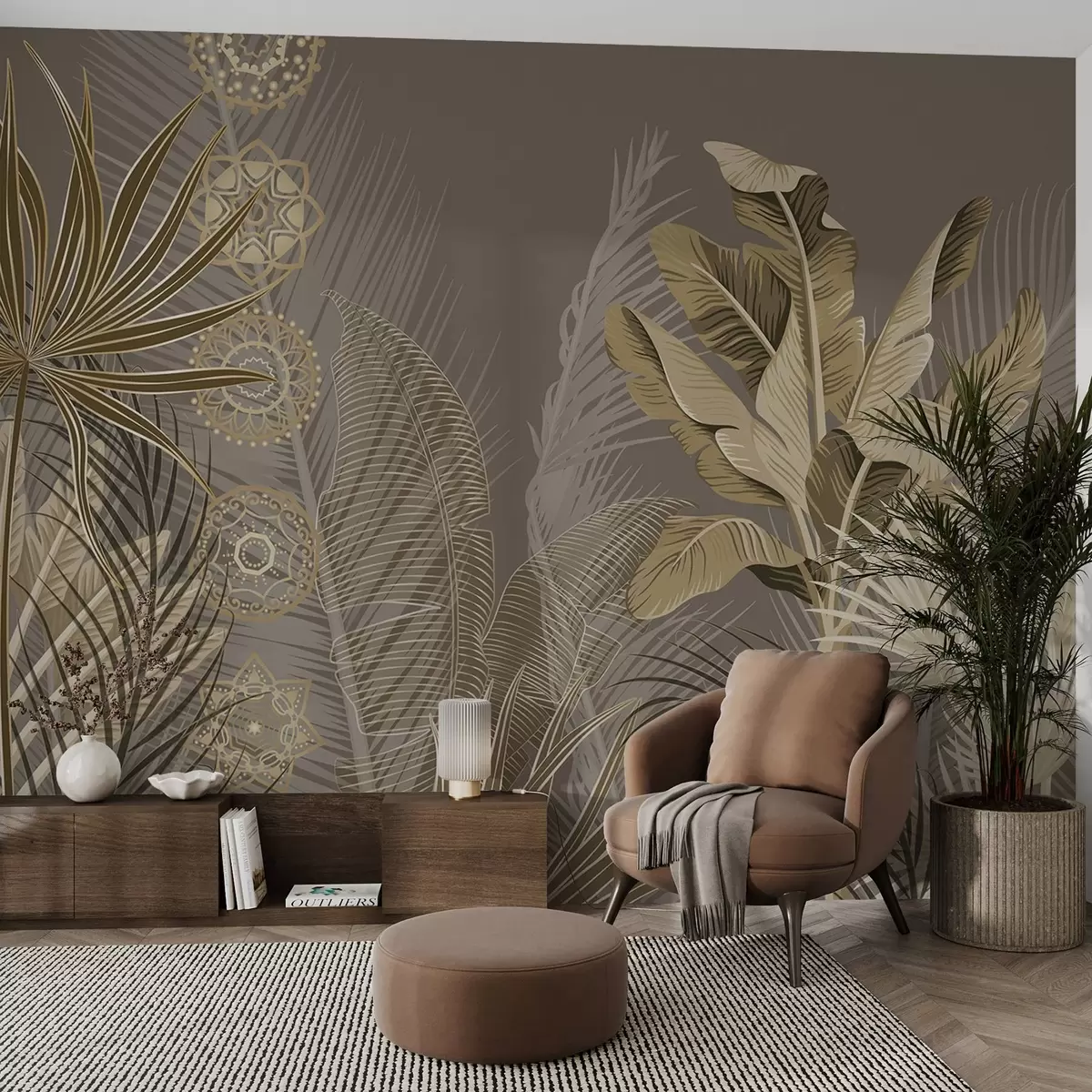 Fotomurales Hojas tropicales en tonos beige y marrón, hojas de palmera, hojas de plátano y adornos de mandala, fondo oscuro Nr. w08913v1