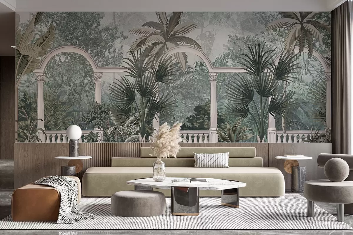 Fotomurales Jardín de textura tropical con palmeras y exuberante vegetación, balaustrada con arcos, colores apagados, estilo vintage Nr. w08916