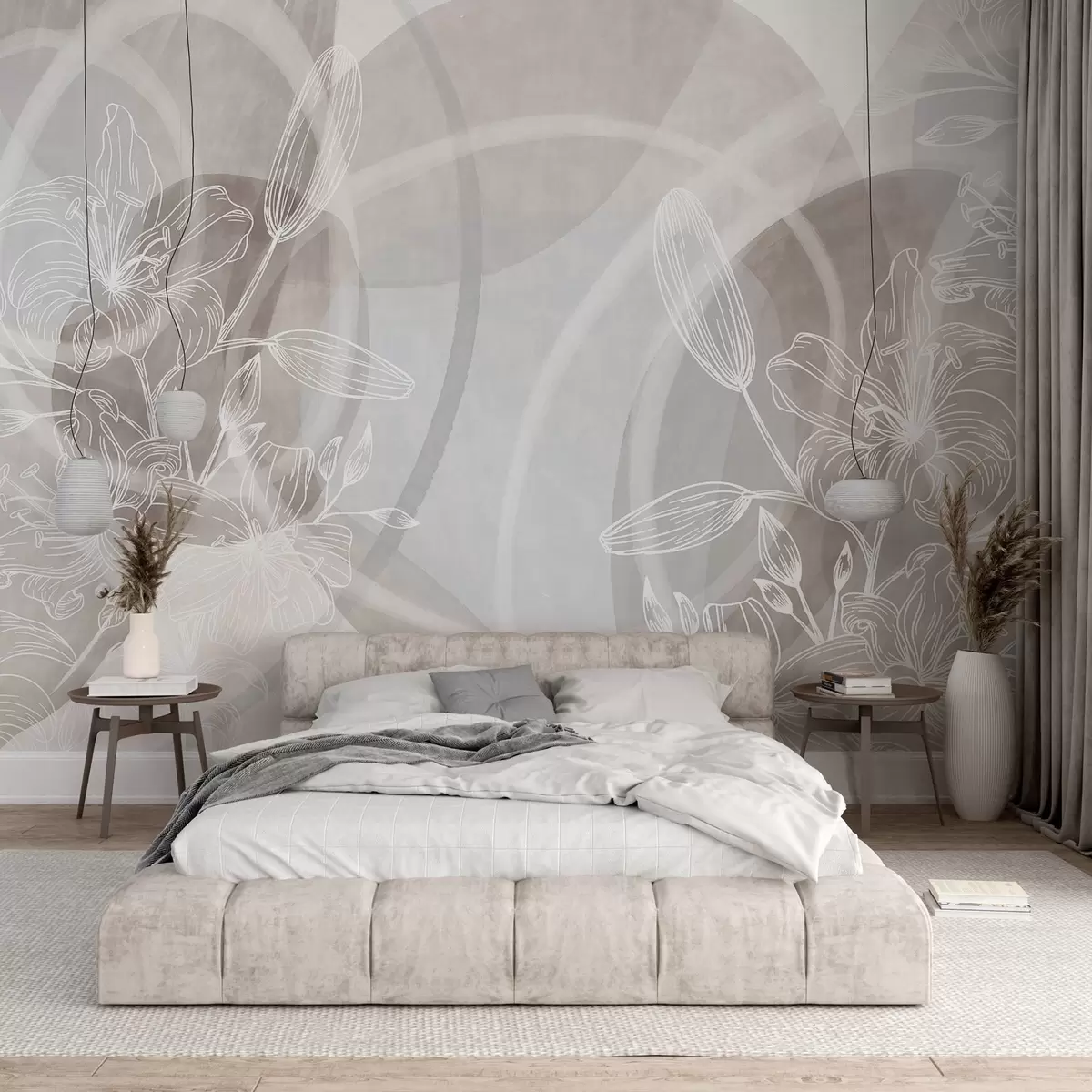 Fotomurales Diseño floral minimalista con flores y hojas blancas, círculos abstractos superpuestos en tonos beige y azul Nr. w08979v1