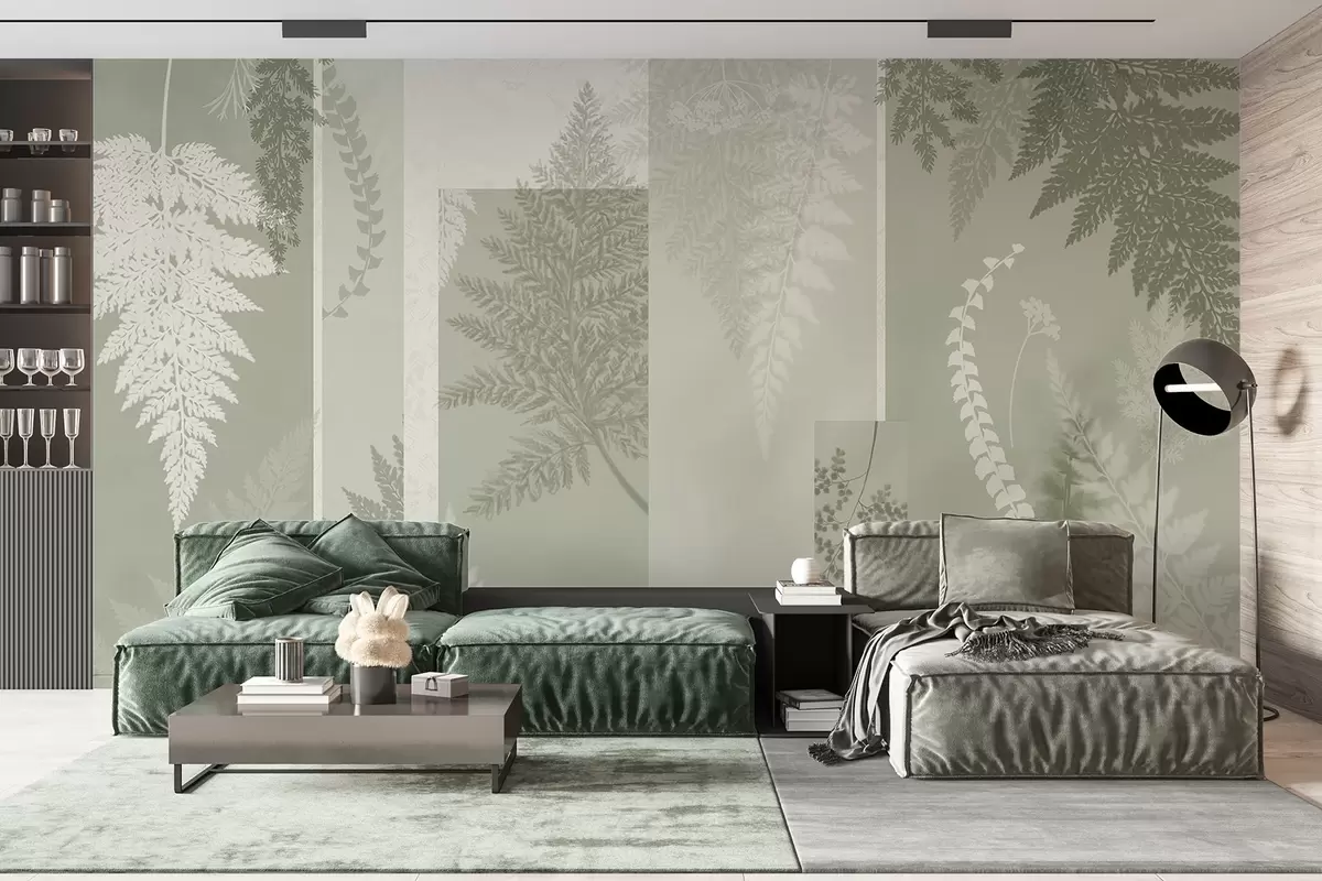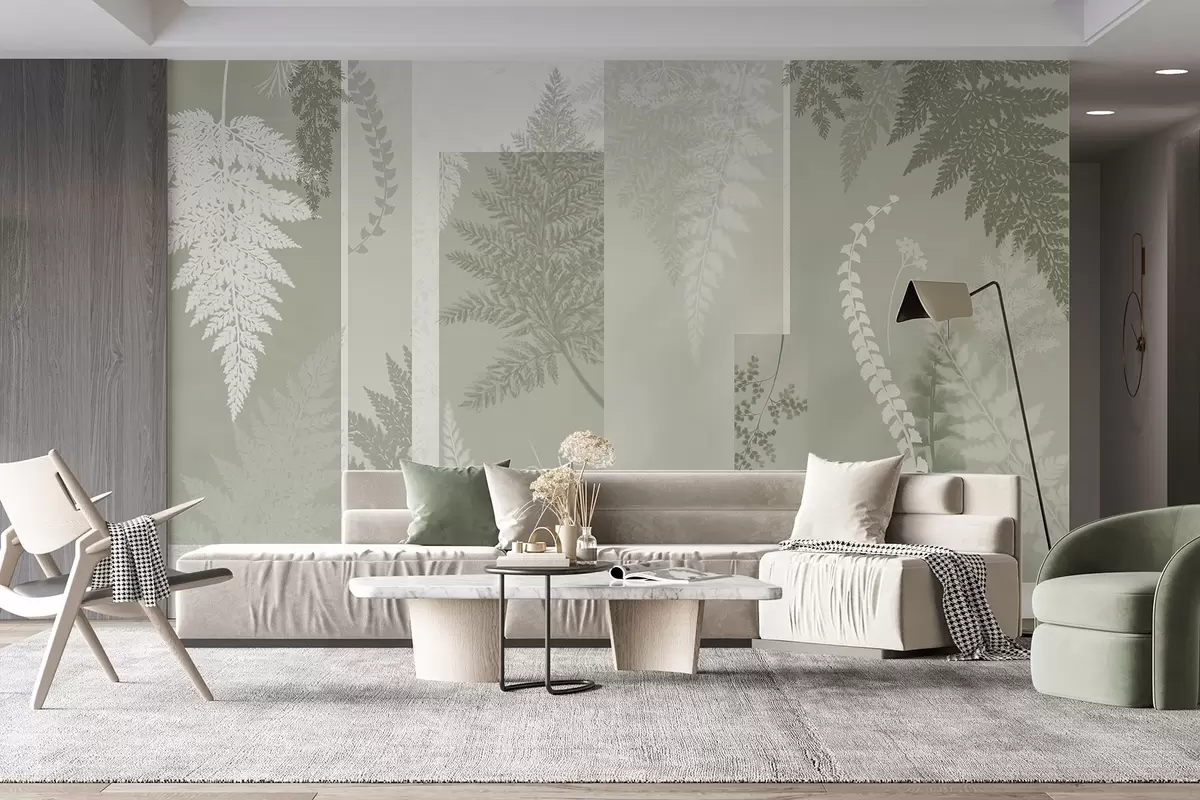Fotomurales Hojas de helecho en verde y blanco, dispuestas en rayas verticales, creando un estampado botánico y minimalista, de colores suaves y apagados Nr. w09007v2