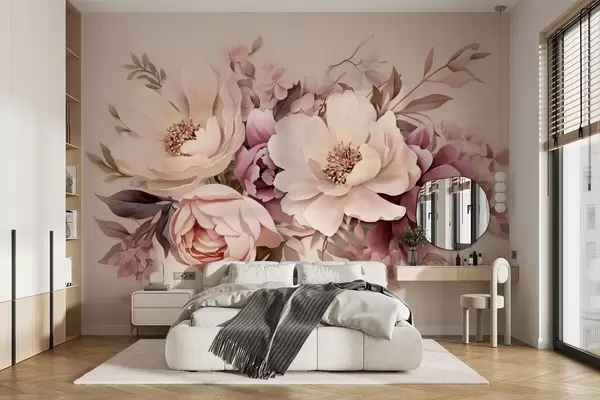 Fotomurales Delicada composición de flores rosas y beige, peonías con hojas Nr. w09019