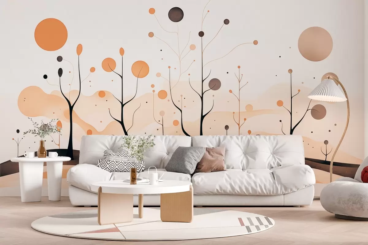 Fotomurales Árboles abstractos con esferas y sol en tonos beige-gris Nr. w09043