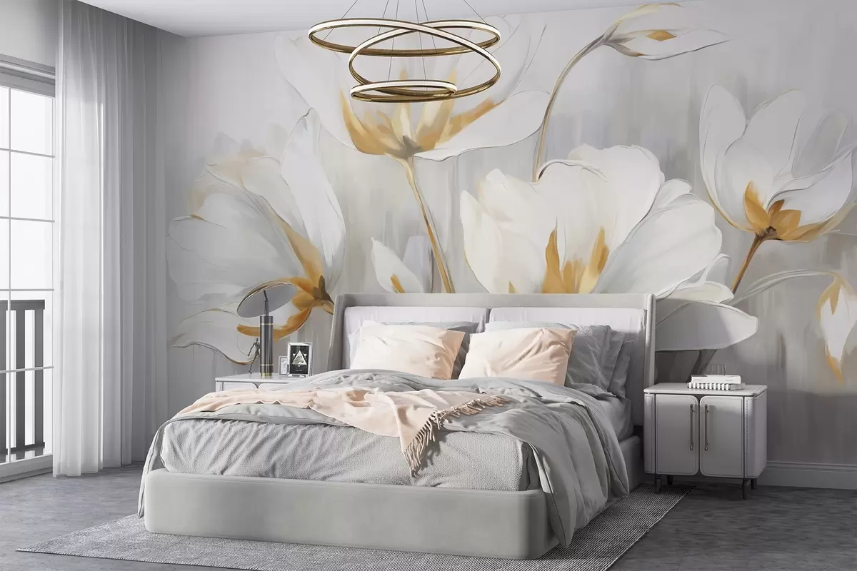 Fotomurales Flores abstractas blancas con pétalos y tallos blancos sobre fondo gris con pinceladas verticales grises y blancas Nr. w09047