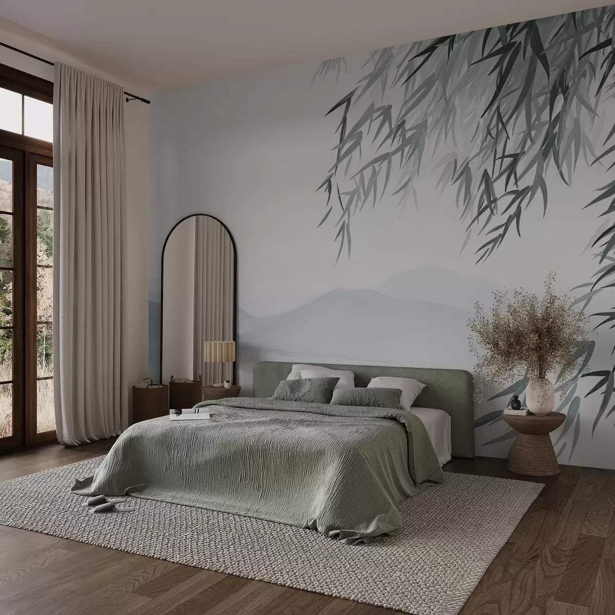 Fotomurales Hojas de bambú colgando sobre un lago con montañas al fondo, suaves tonos azules y blancos, estilo de pintura de lavado de tinta Nr. w09048