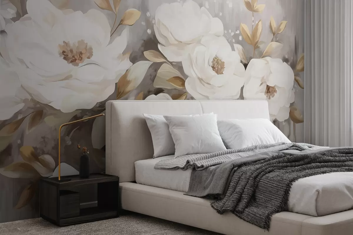 Fotomurales Flores blancas con hojas amarillas, pétalos suaves, delicado arreglo floral, paleta de colores neutros, pinceladas texturizadas Nr. w09062