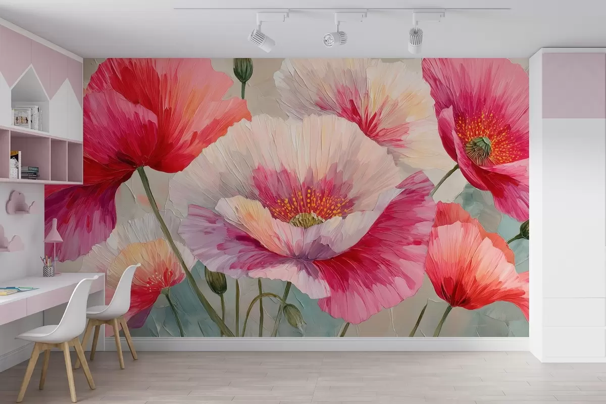 Fotomurales Amapolas blancas y rojas al óleo con pinceladas atrevidas Nr. w09097