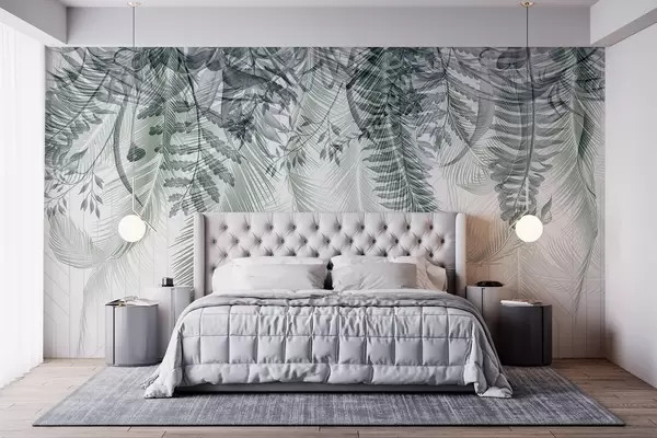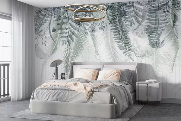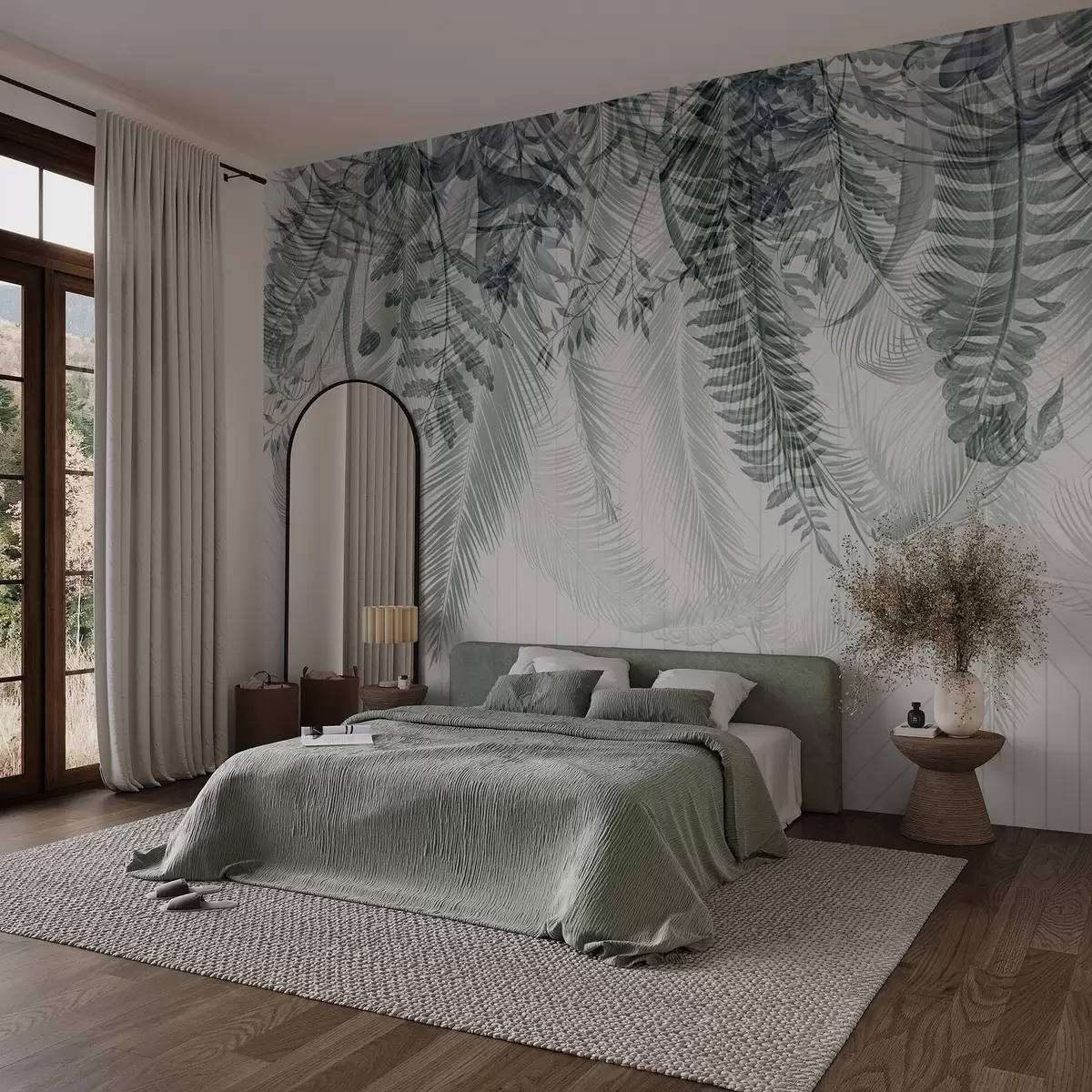 Fotomurales Delicada caída de helechos tropicales y hojas de palmera, fondo geométrico, luz suave, colores apagados, elegante Nr. w09106