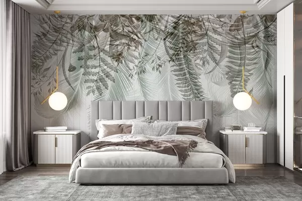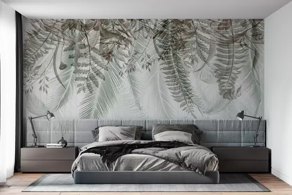 Fotomurales Delicada caída de helechos tropicales y hojas de palmera, fondo geométrico, luz suave, colores apagados, elegante Nr. w09106v1