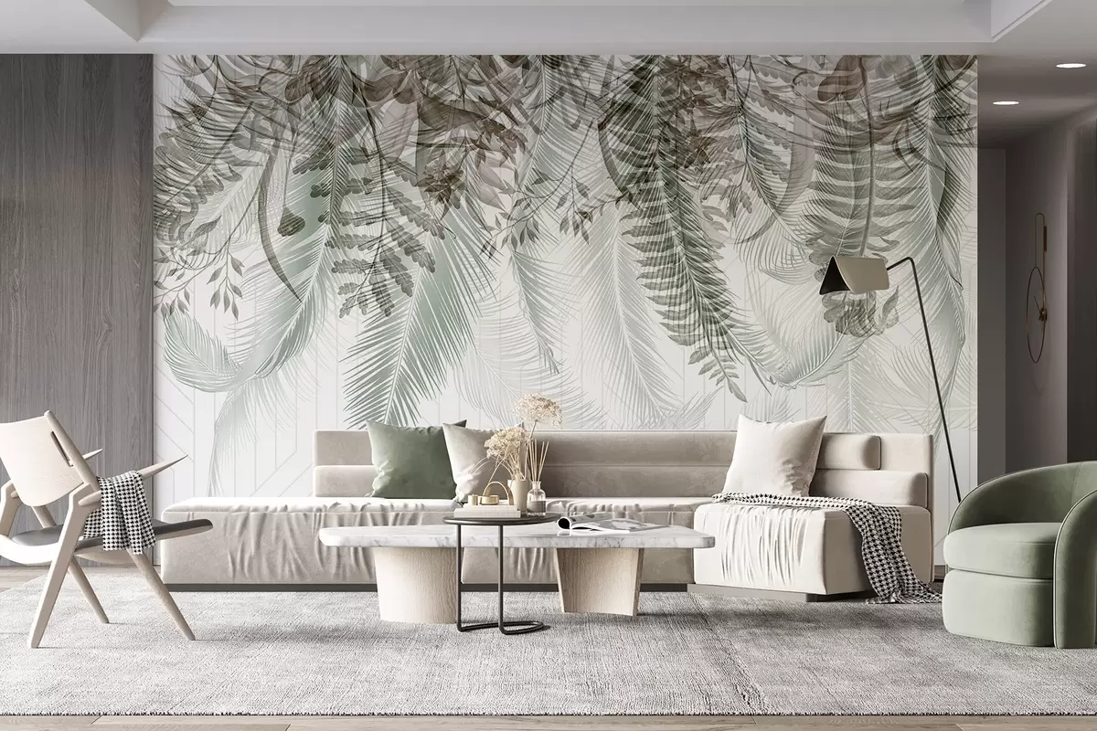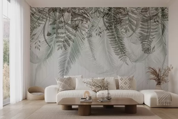 Fotomurales Delicada caída de helechos tropicales y hojas de palmera, fondo geométrico, luz suave, colores apagados, elegante Nr. w09106v1