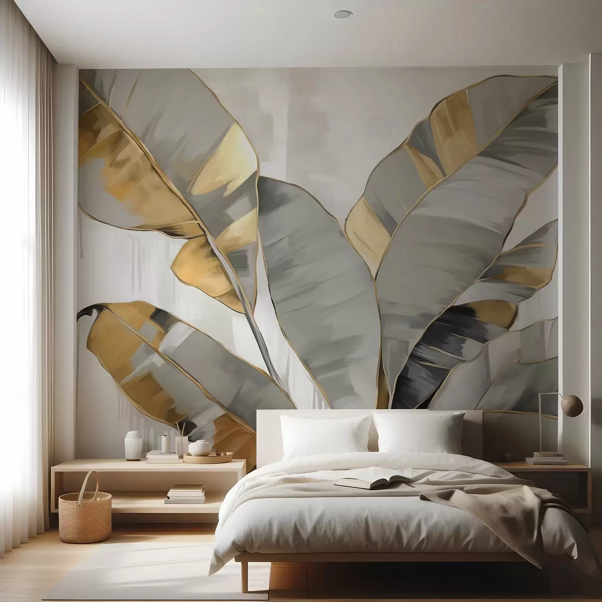 Fotomurales Plátano tropical con textura de hojas en tonos grises y amarillos, estilo moderno, fondo neutro, cuadro decorativo Nr. w09118
