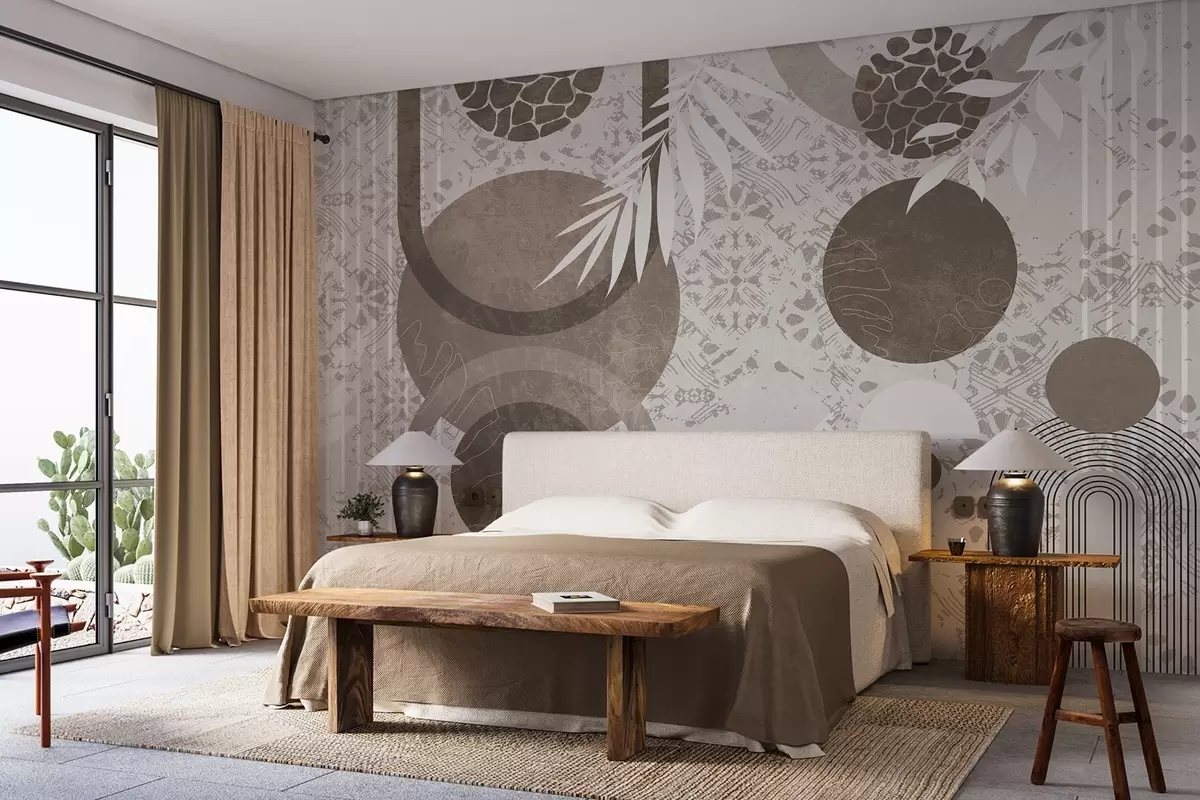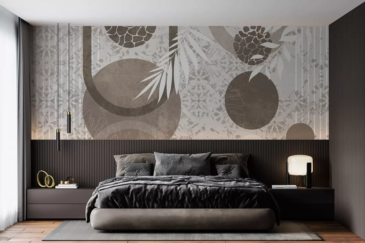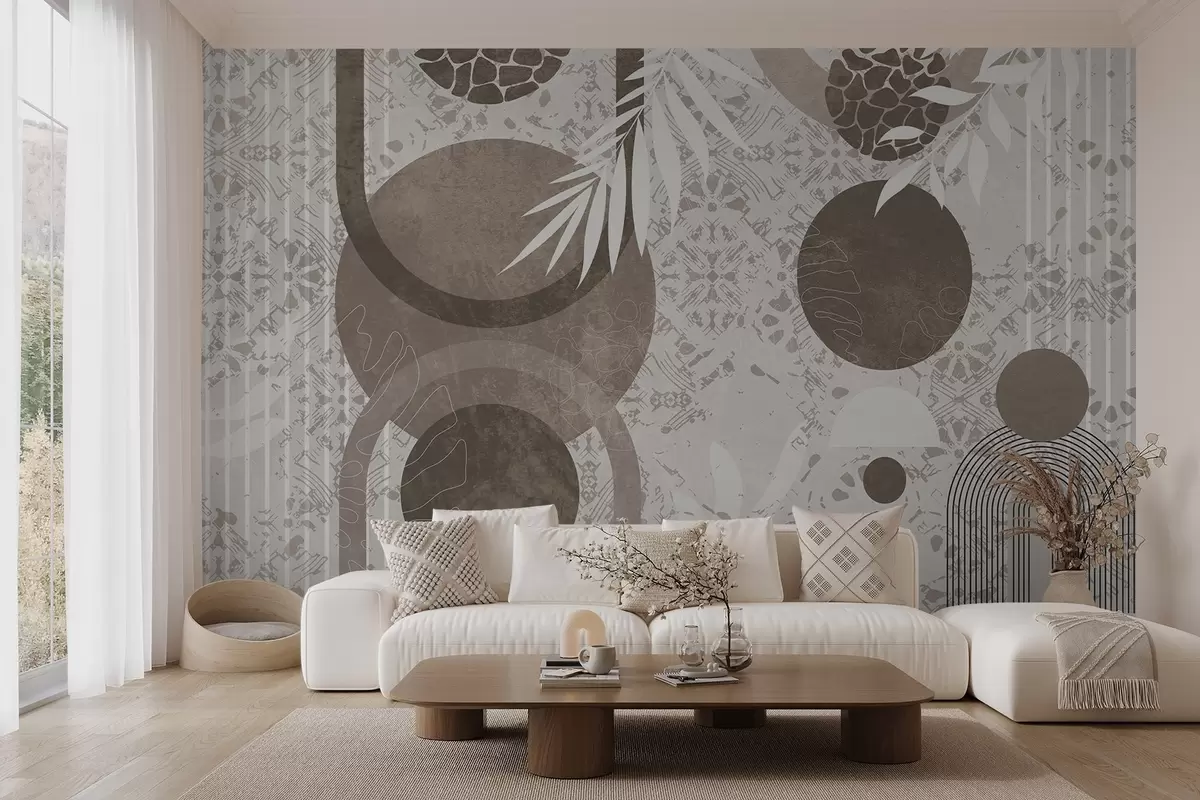 Fotomurales Formas geométricas abstractas texturadas en marrón y blanco, círculos, arcos y elementos botánicos, diseño moderno y minimalista Nr. w09130