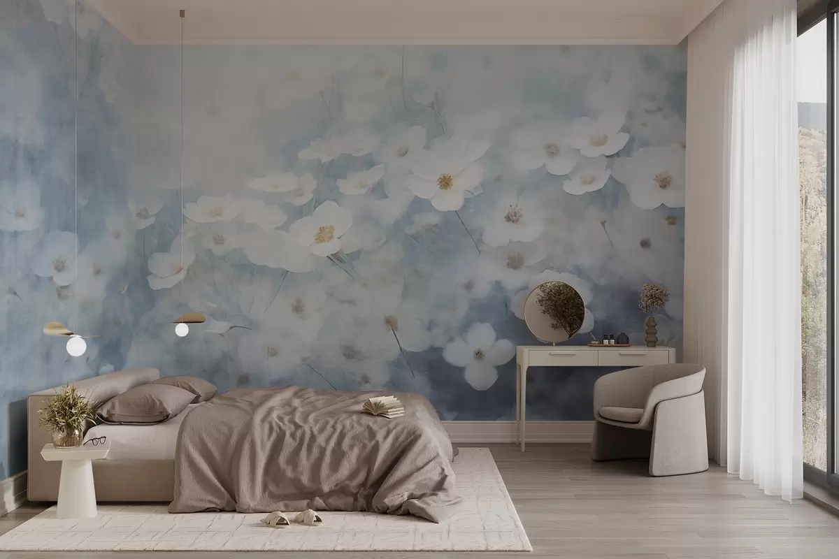 Fotomurales Campo texturizado de flores blancas de anémona, enfoque suave, atmósfera de ensueño, paleta de colores azul claro y blanco, prado primaveral Nr. w09134