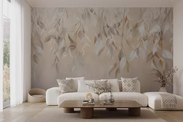 Fotomurales Hojas colgantes de textura blanca y beige con una suave paleta de colores, melocotón, gris y blanco delicado de fondo Nr. w09136