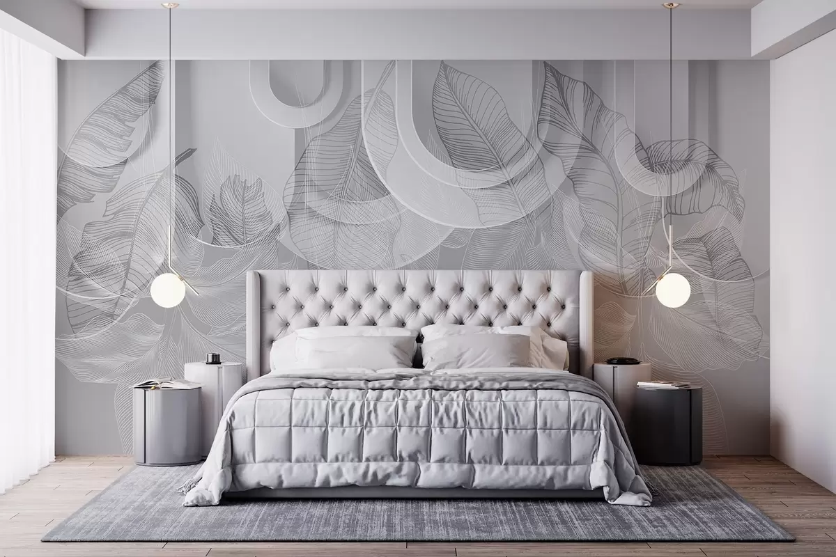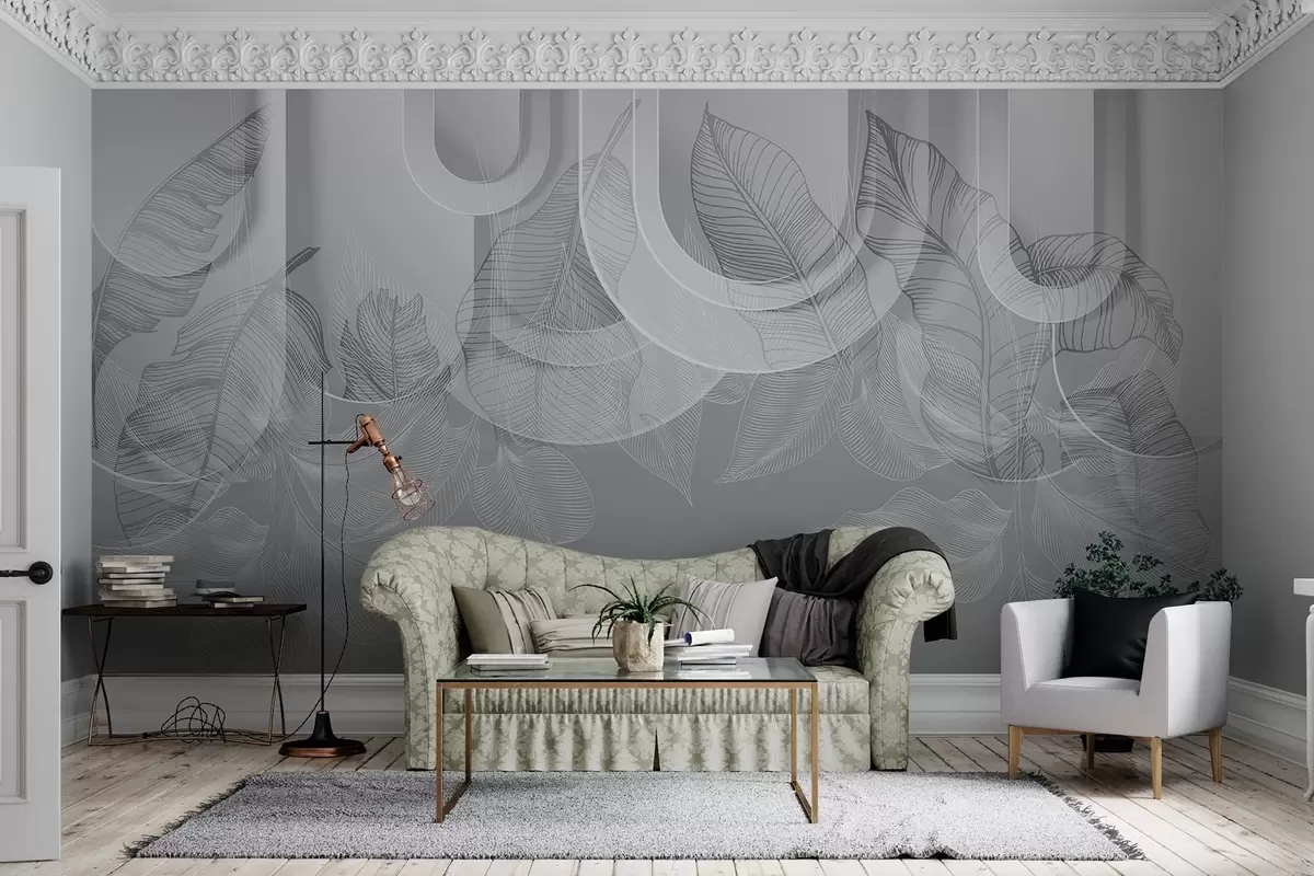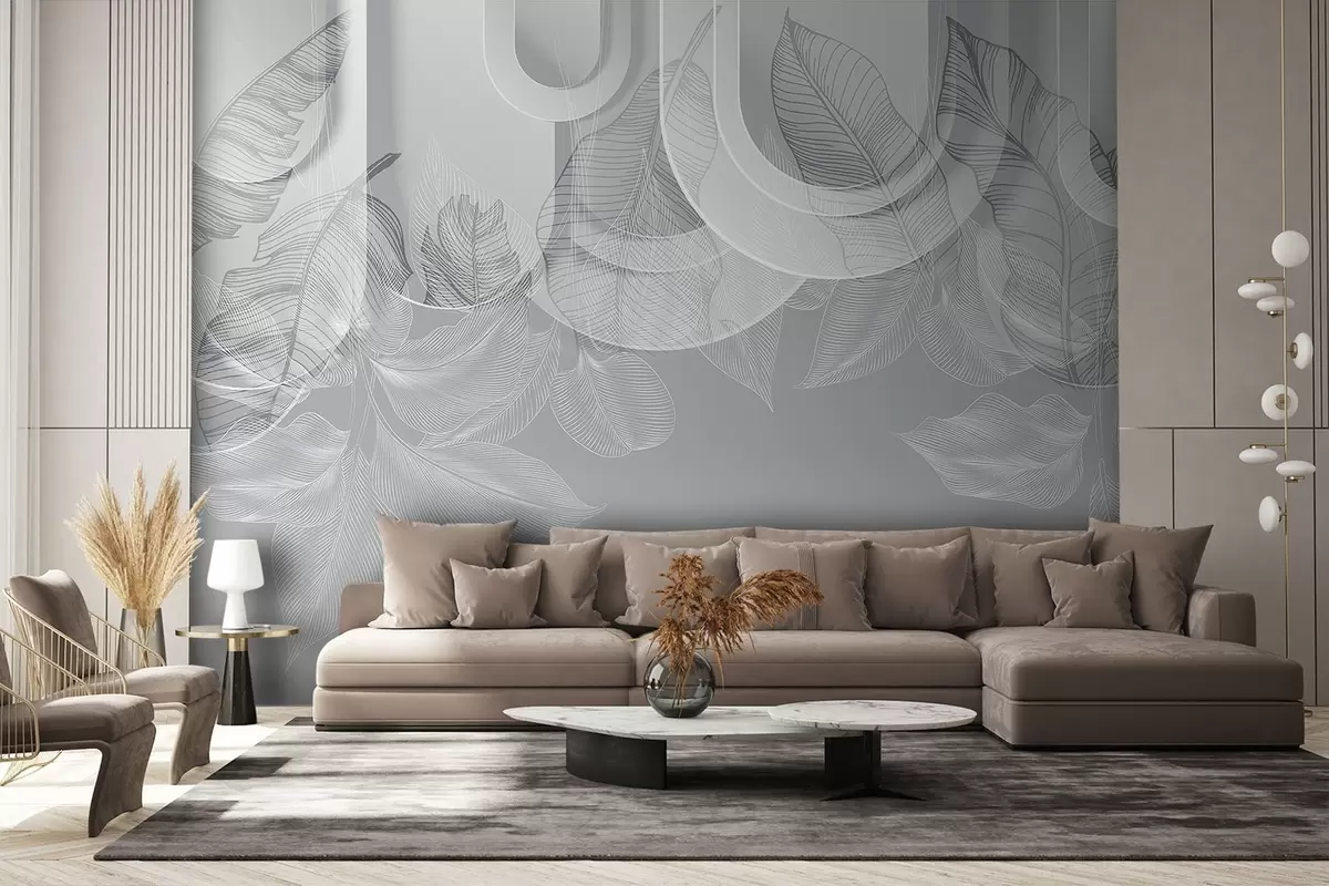 Fotomurales Fondo abstracto con arcos grises y hojas tropicales blancas, diseño minimalista, elegante y moderno, paleta de colores neutros Nr. w09138