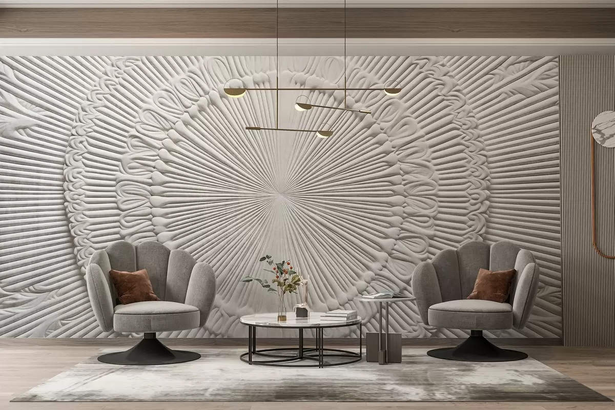 Fotomurales Estampado circular abstracto texturizado con líneas radiales y elementos decorativos, diseño simétrico, textura en relieve Nr. w09154
