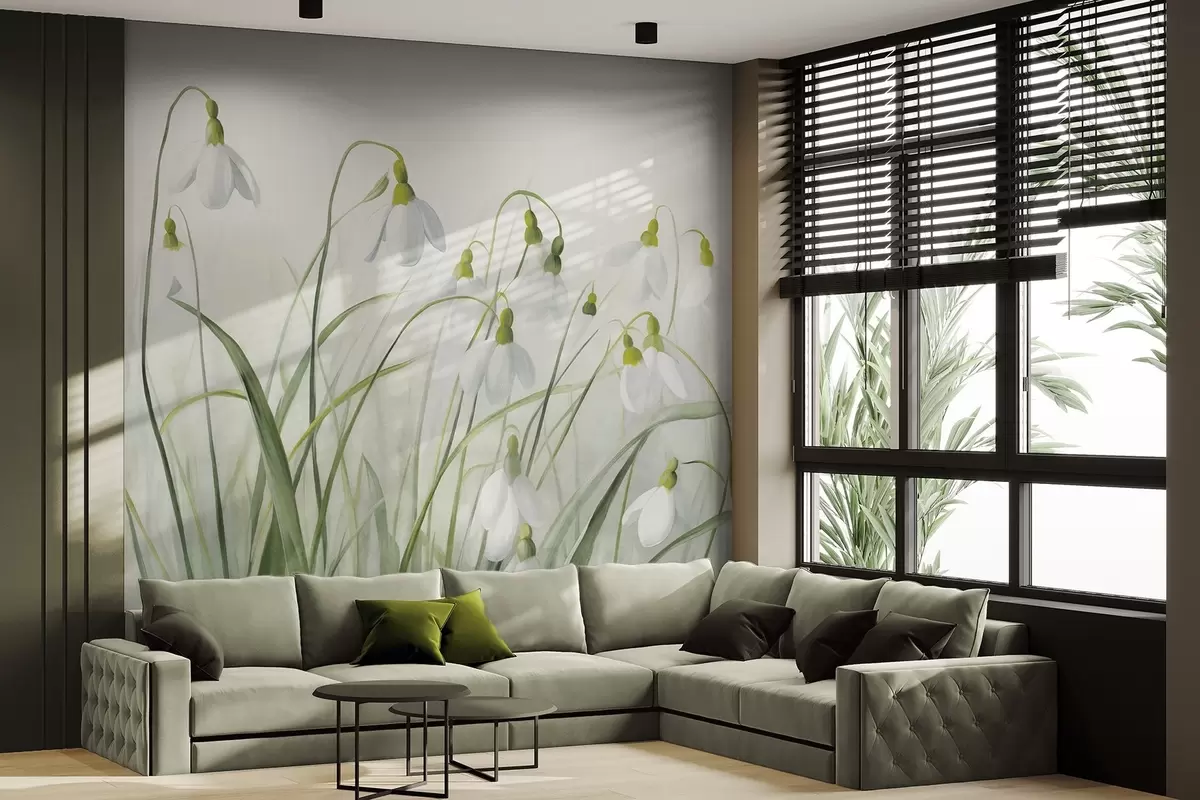 Fotomurales Flores de campanillas de invierno con tallos y hojas de textura verde, estilo acuarela primaveral, pinceladas delicadas Nr. w09195