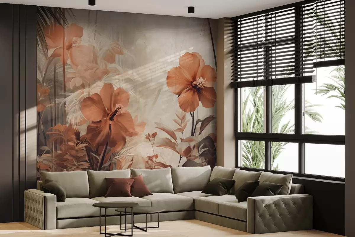 Fotomurales Flores de hibisco rojo pastel con hojas y tallos, vegetación tropical, colores suaves y apagados, estilo vintage Nr. w09203